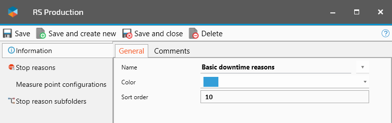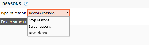 In the Reason Manager, select what type of reason code to manage. In the top left corner, select from stop/scrap/rework. Note that stop reasons handles both downtime and speed loss.