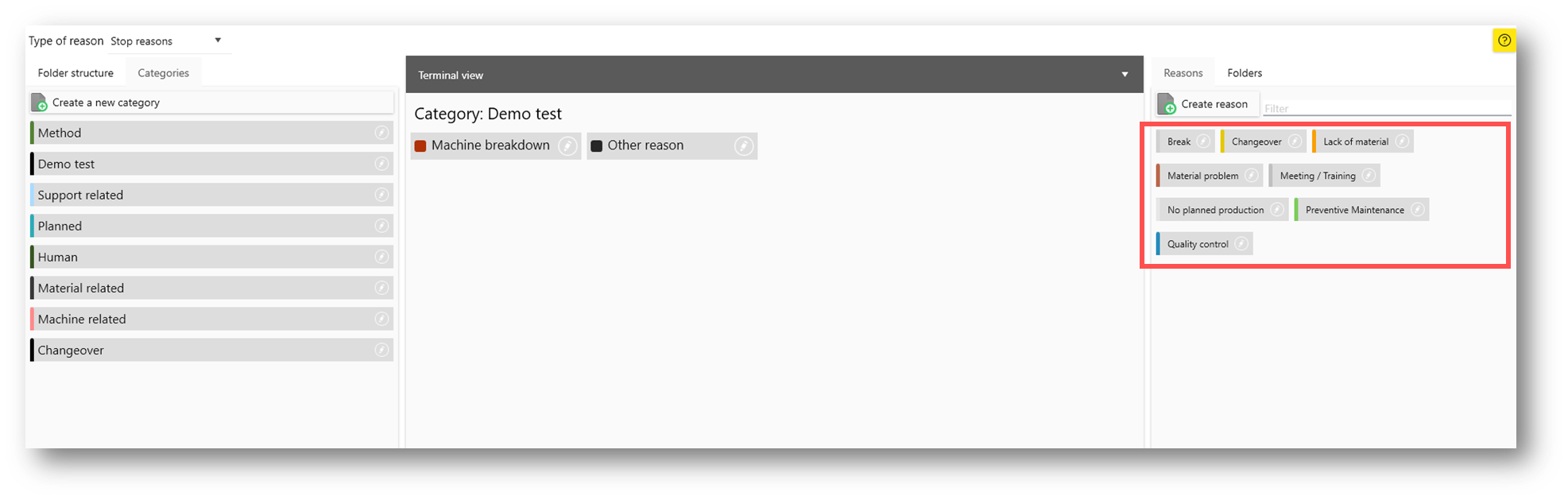 If you’re following the example, name the first one “Basic reason codes". Then, create two more and name them “Planned stops” and “Unplanned stops”.