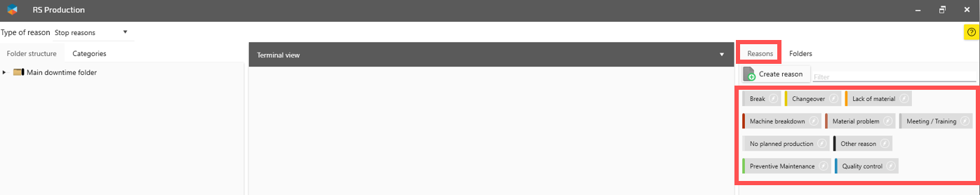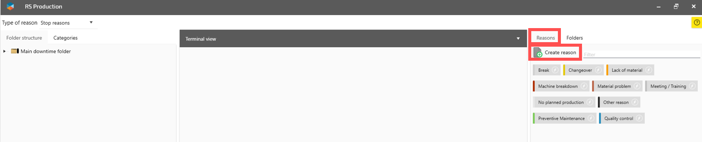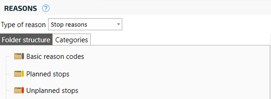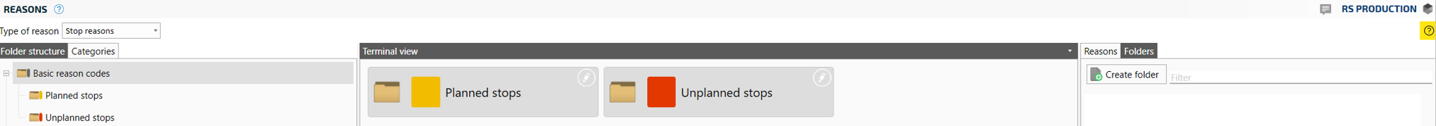 To make the user interface easy for machine operators, RS Production use folders to only show relevant reason codes to machine operators. Read more about the concept Reason code folders