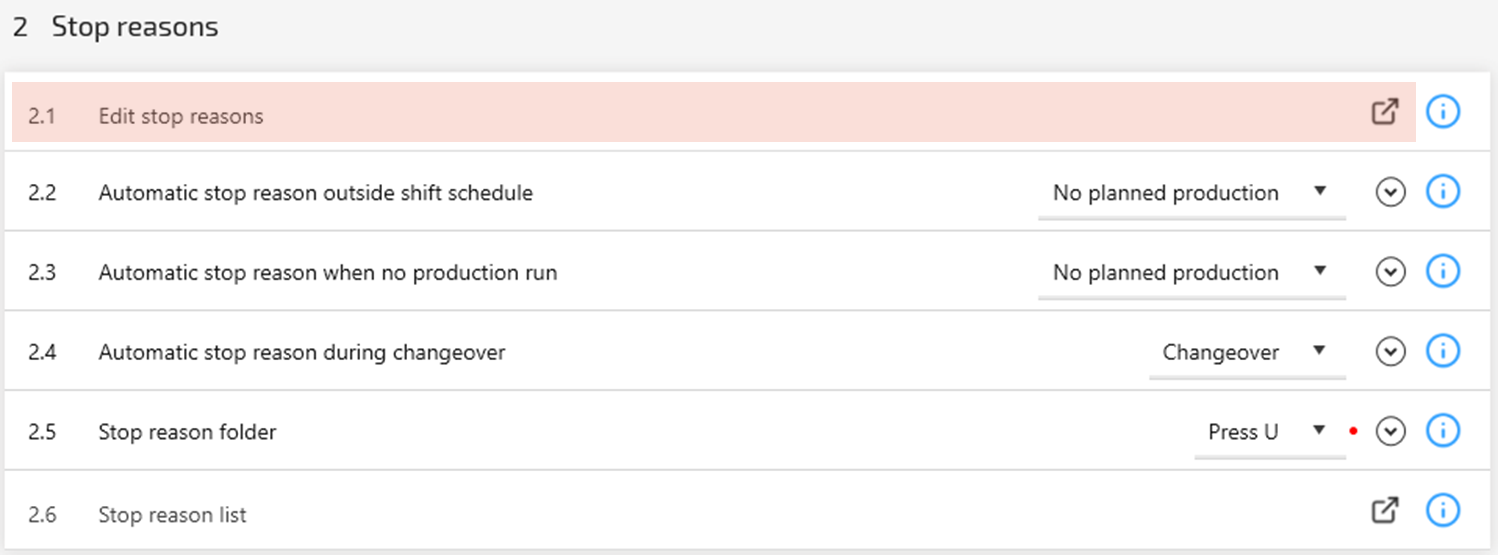 Follow the link to the right on the Edit stop reasons row to open the Reason Manager.