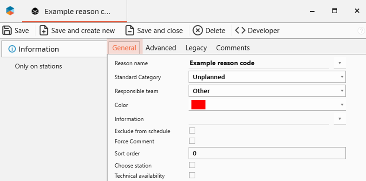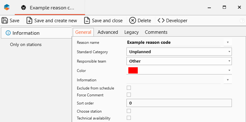 Sort order | Decides in what order the reason codes are shown in Operator tools. Lowest number first. From left to right and from top to bottom. | |