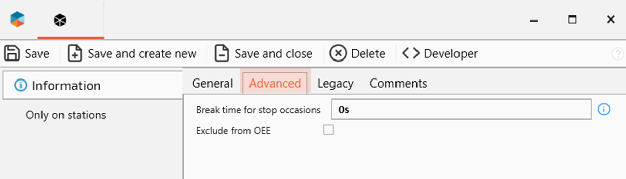 Technical availability | Only for stop (downtime + speed loss) | Mark this to include the loss in the calculation of maintenance KPI like technical availability, MTBF and MDT. |