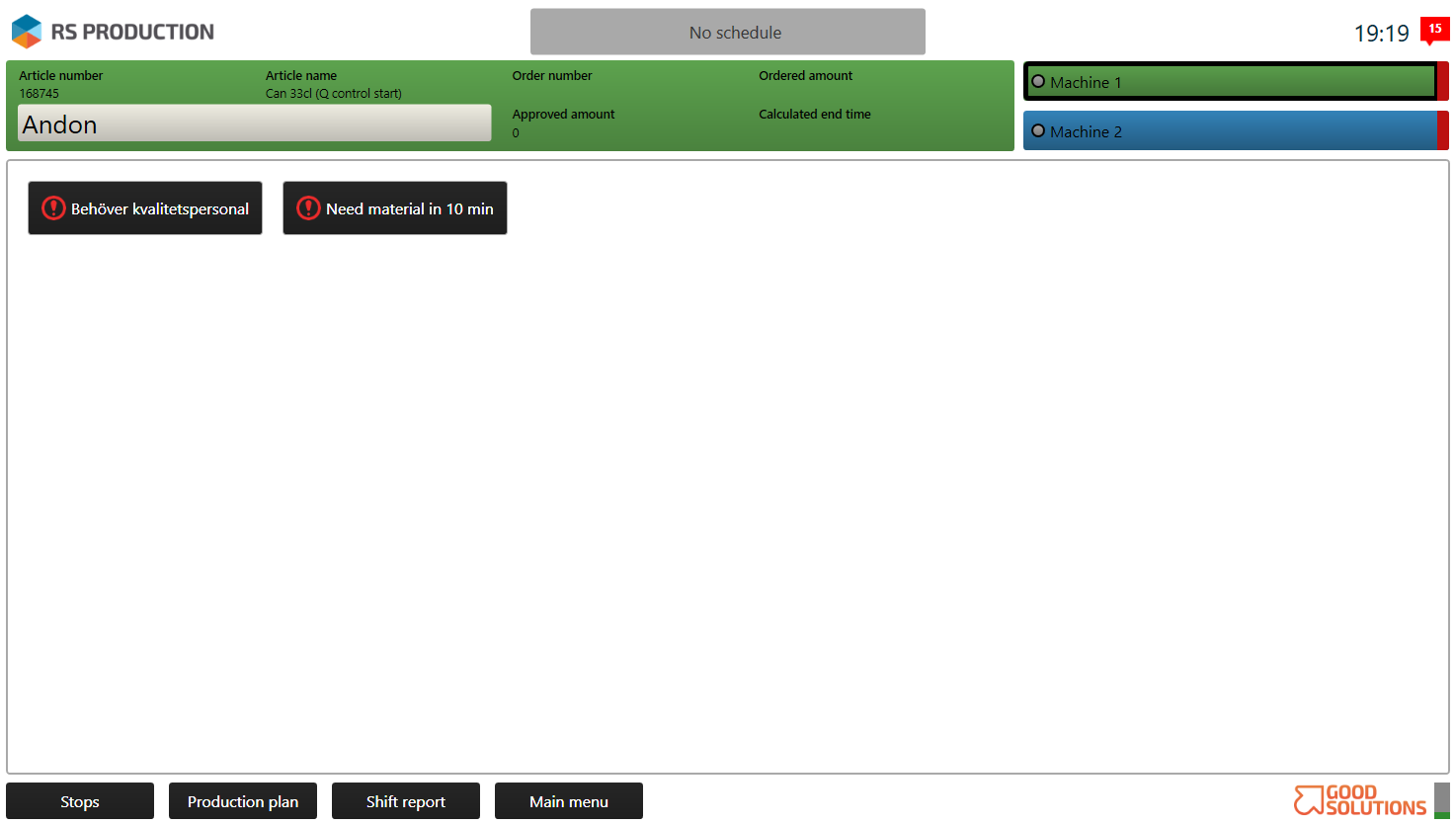 Andon is connected to the messaging system and RS Production Mobile.