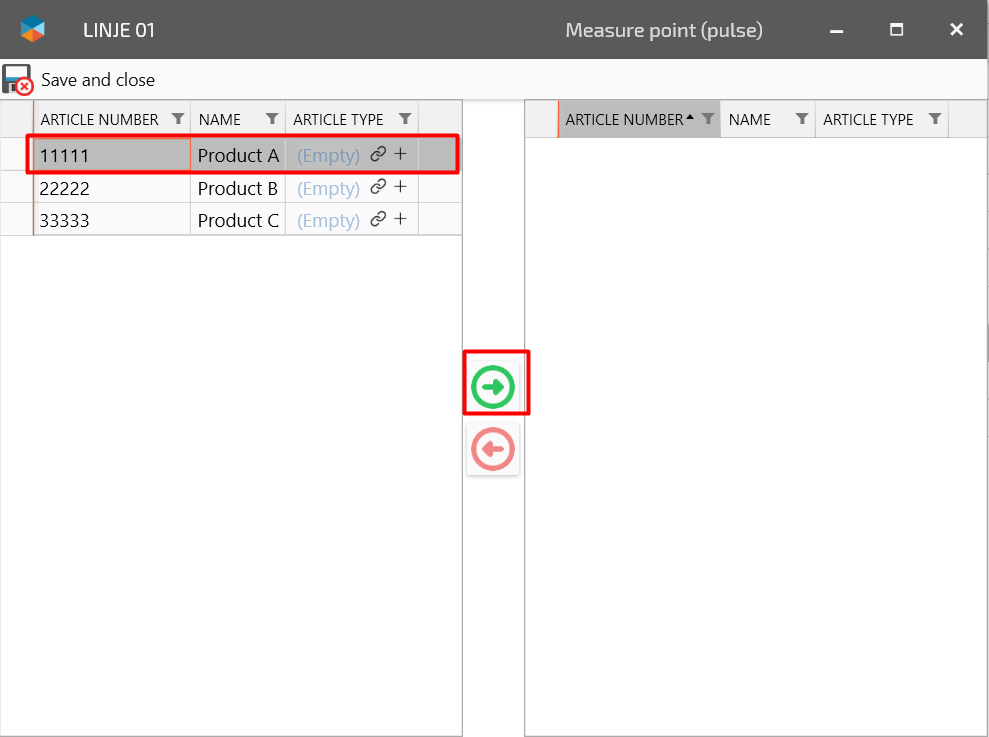 If you need to remove an article from a measure point, follow step 6 but press the red arrow on the marked article in the right column to remove it.