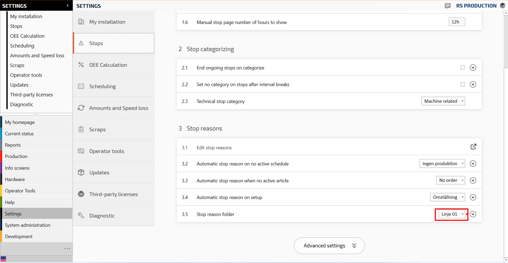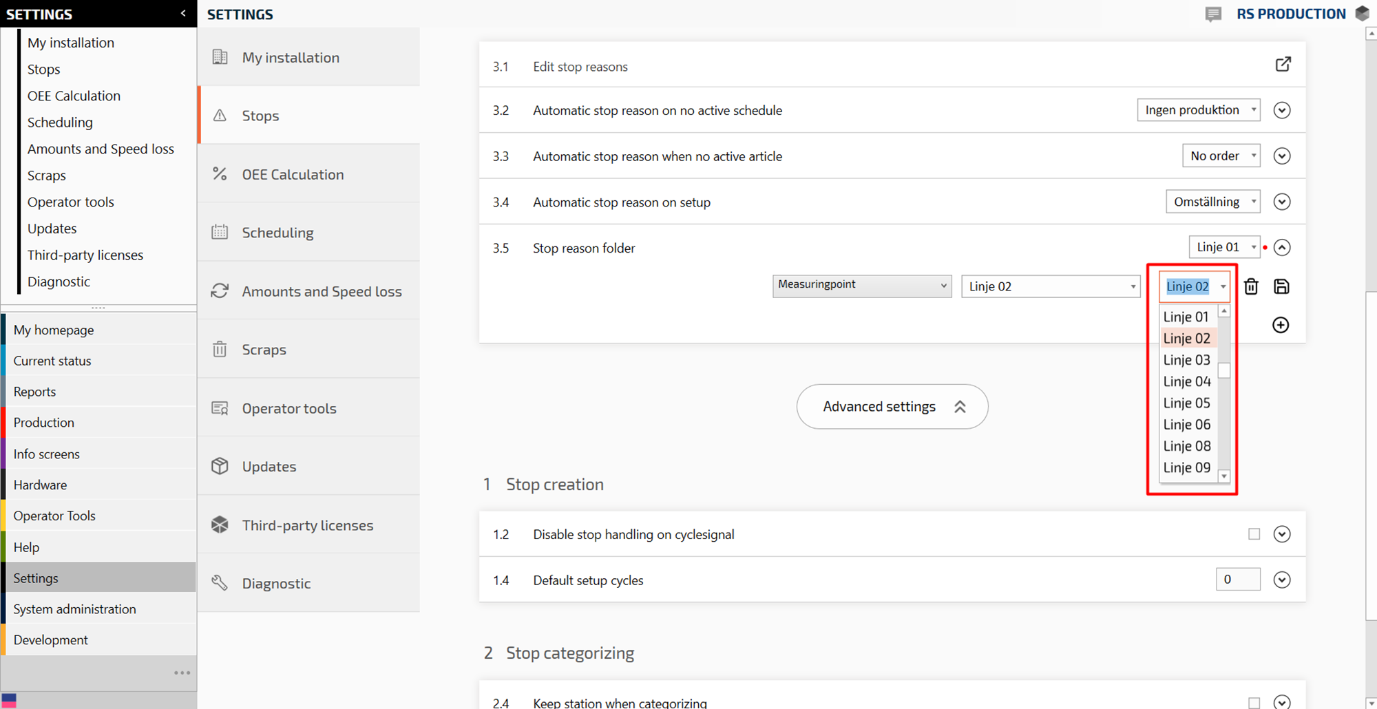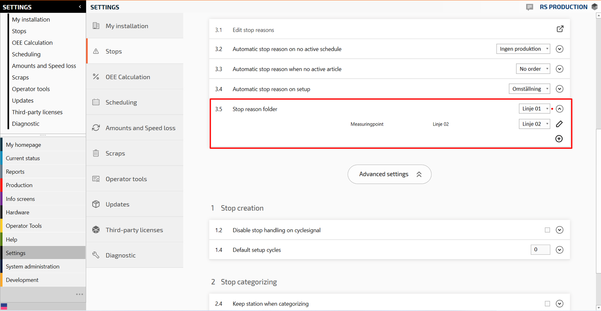 Now there should be a standard stop reason folder for all measure points. Follow the next steps to add another stop reason folder to a specific measure point or section.