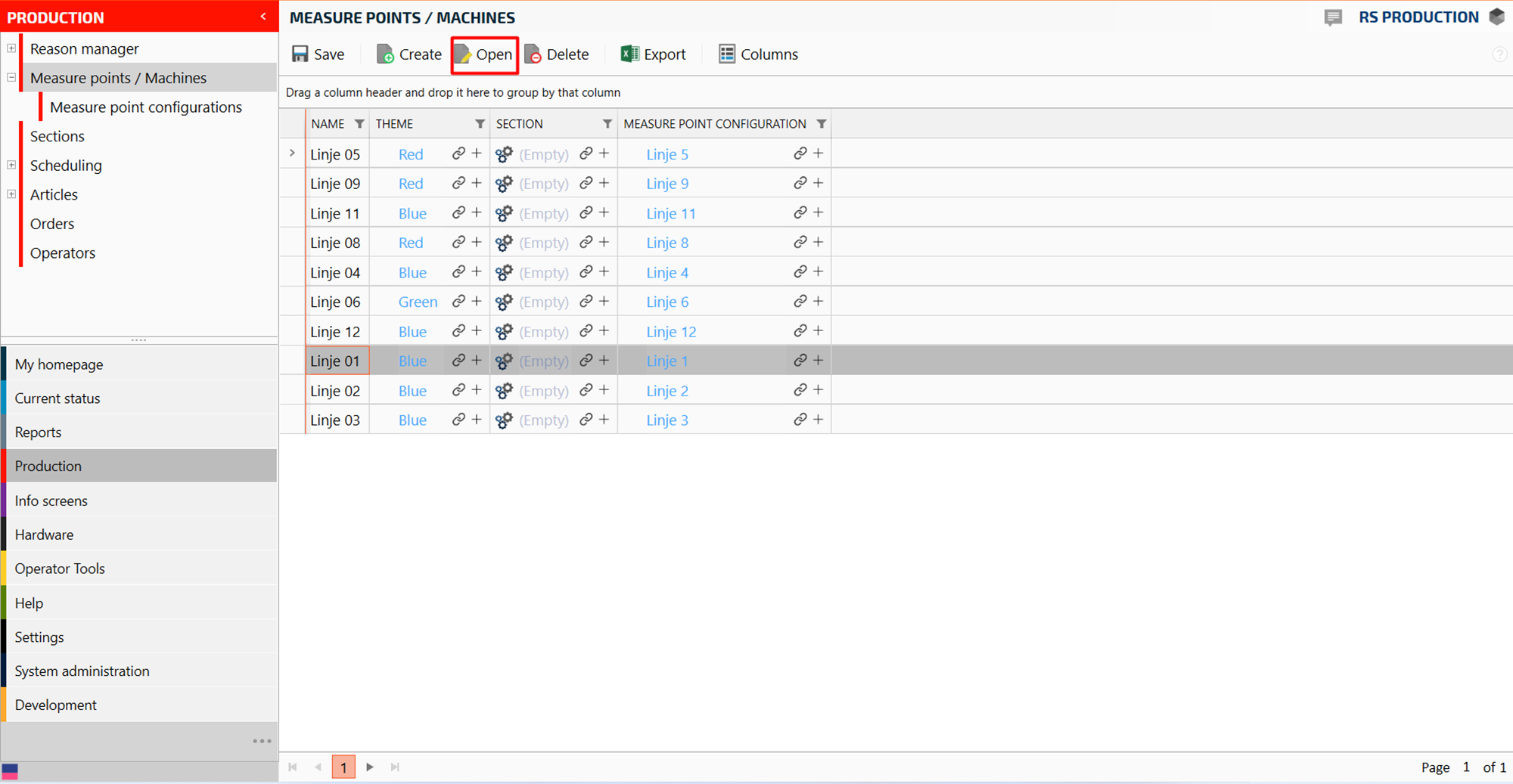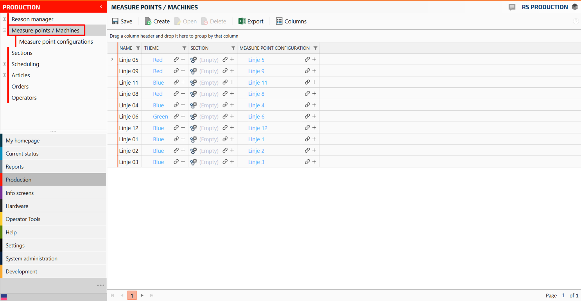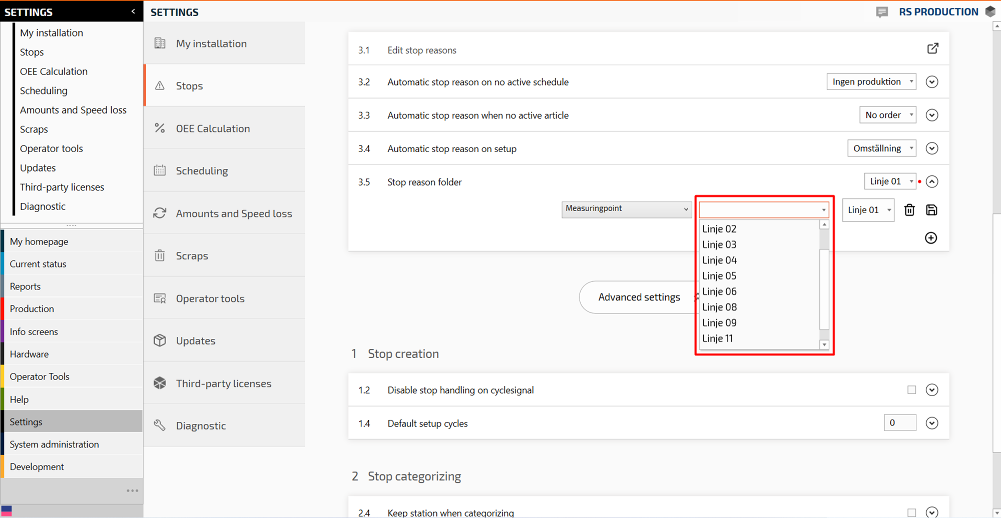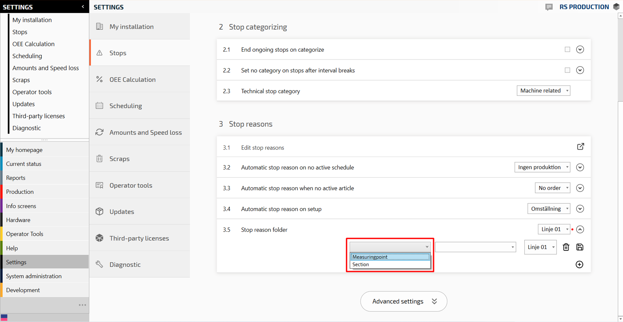 Select measure point in the drop down menu (or “Section” if you want the same stop reason folder for the entire section)