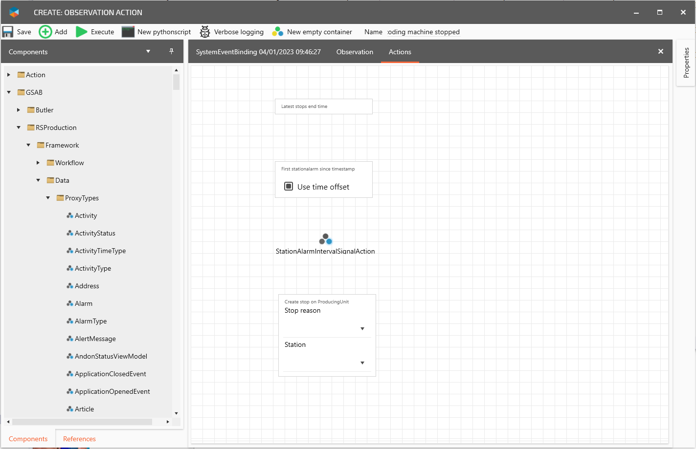 14. Select “stationAlarmIntervalSignalAction” component, hold “Alt” key on the keyboard and click on “Create stop on ProducingUnit” component. Select “Station” on the left in the popup and then “Station” on the right in the popup.