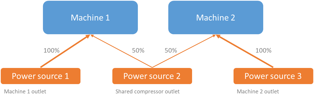 Each energy measure on machine equipment is equal to a power source in RS Energy. A measure point can be connected to one or more power sources, it is also possible to set how much the power source that contributes to the connected machine with a percentage value between 0 to 100%.
