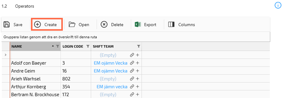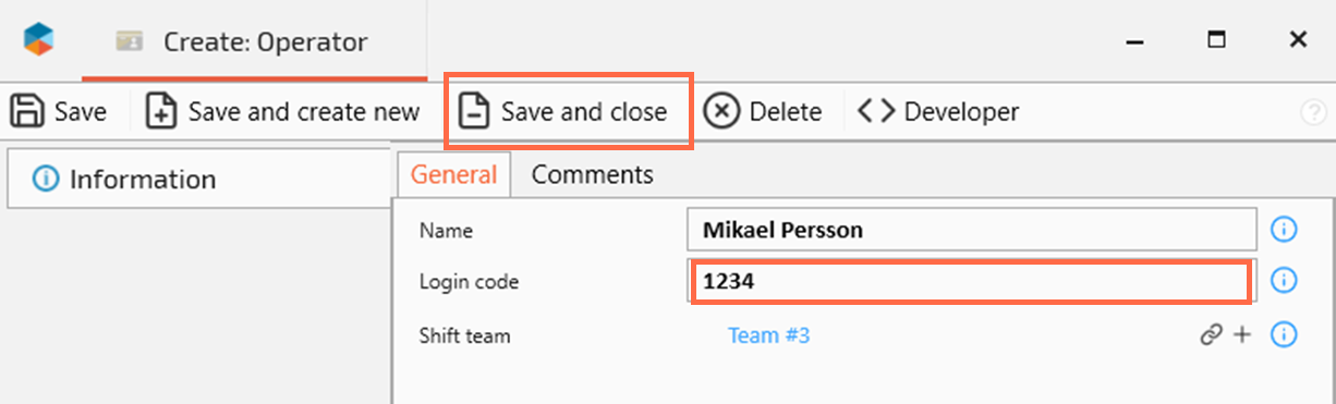 Add Name and Login code. The Login code is the numeric code the operator will use to clock in in Operator tools.