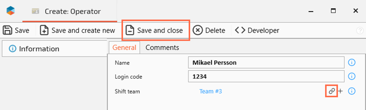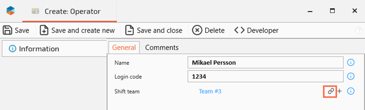 Assigning a shift team is optional. Click the “chain” cymbol to assign the operator to an existing Shift team. Click the “+” button to the right of the “chain” if you want to add a new Shift team.