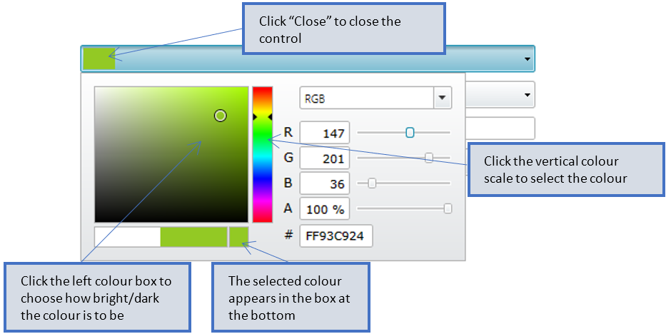 If you want to select your own colours you must start by selecting a colour from the vertical colour scale in the middle of the control. If you then point in the large colour box to the left of the control, you can adjust the brightness/darkness to suit your preferences.