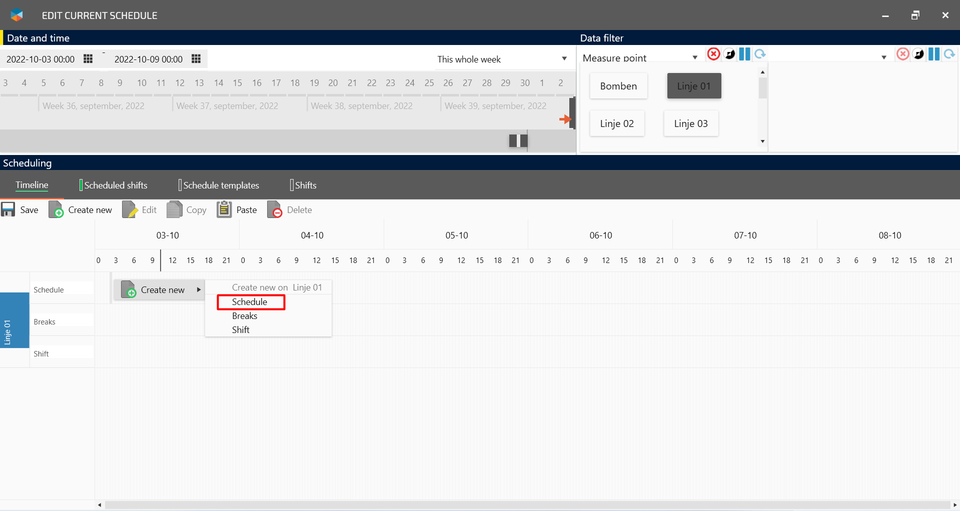 Add shift template to timeline of measure point