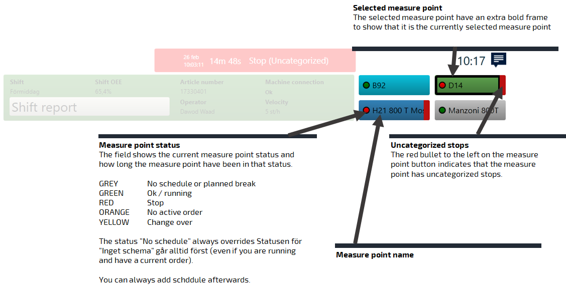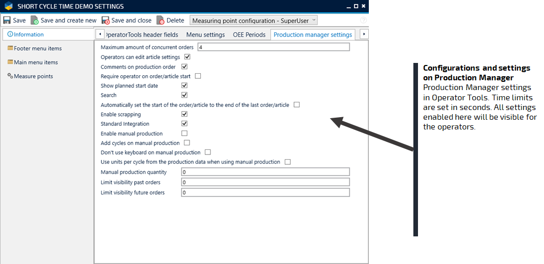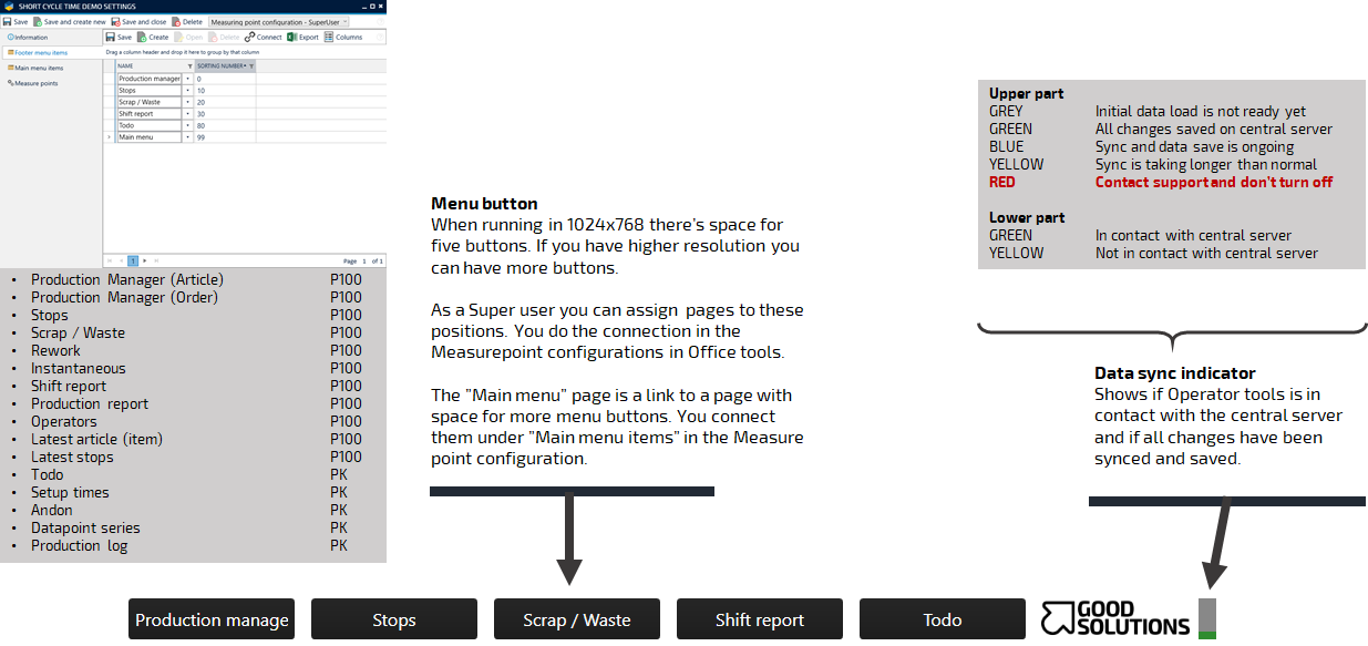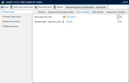By setting a ”Start page menu item” and a ”Operator login – Page menu item” in the Measure point configuration you can automatically direct the user to certain pages when starting Operator tools and when clocking in as an Operator.