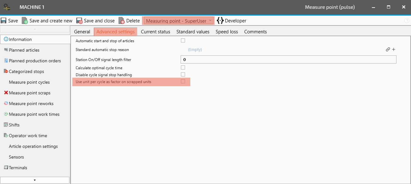 When “Use unit per cycle as factor on scrapped units” is activated, each registered scrap will be multiplied with the article’s+measurepoints’s “Units per cycle”.