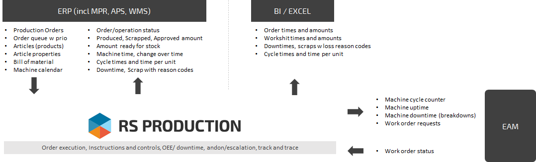 This is a selection of typical integrations in a RS Production solution using both standard and custom integrations. Note that it is also possible to add the Machine Data Interface to integrate with machines.