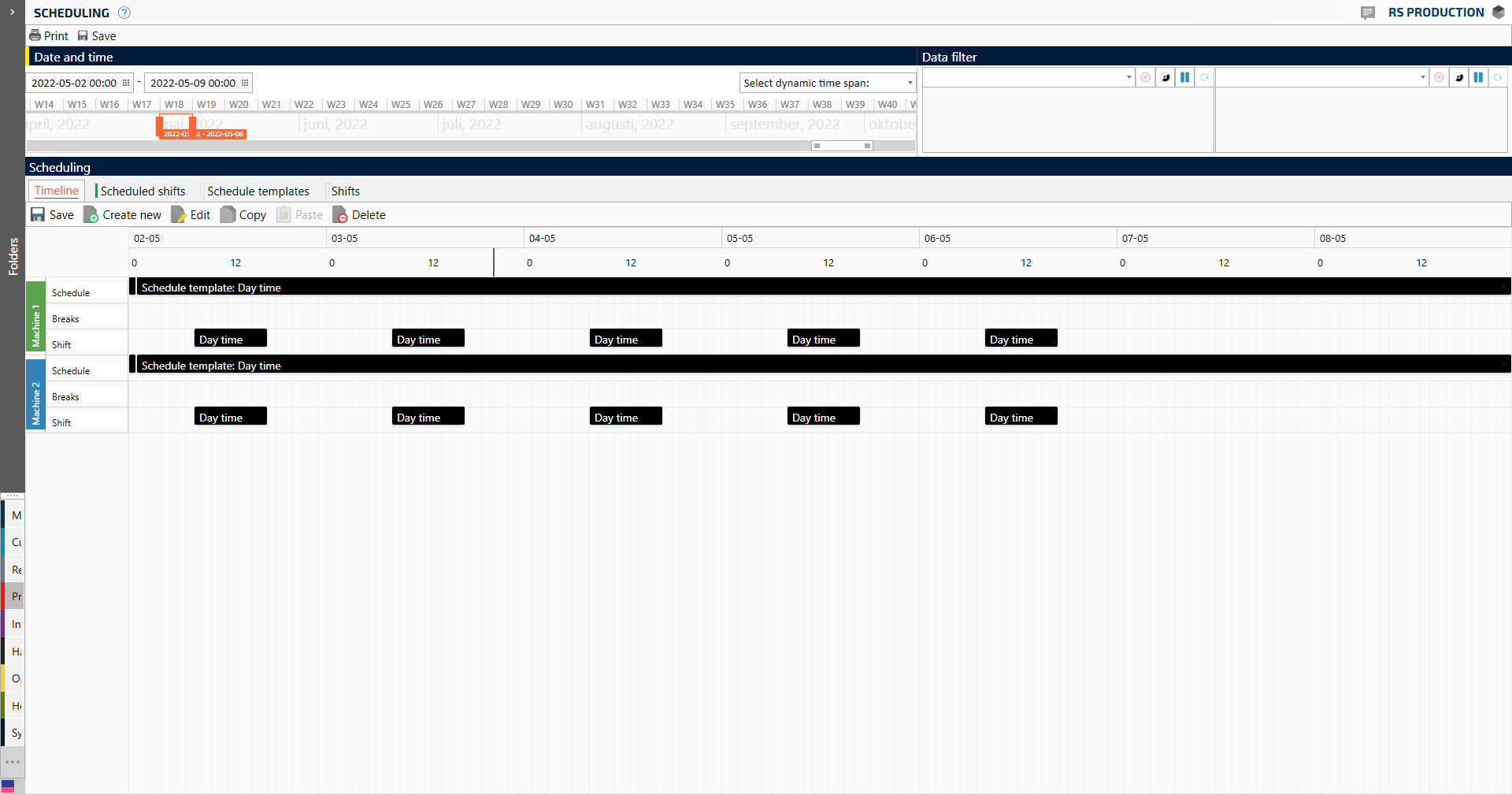 Use the visual scheduling to define shift schedules and machine time calendar. Automatic scheduling into the future. Handles breaks and planned shifts.