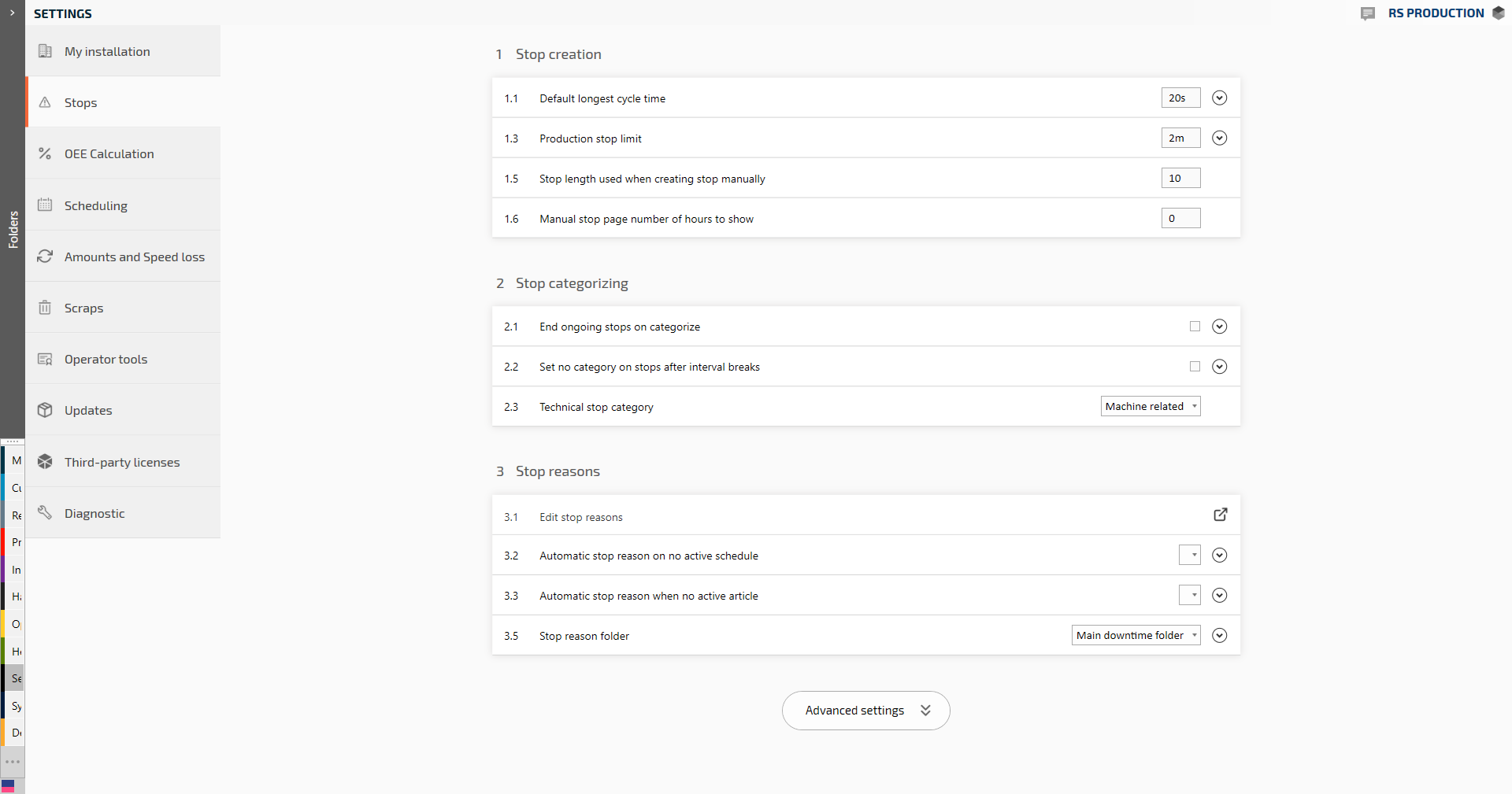 The visual reason manager helps to setup and maintain reason codes for downtime, speedloss, scrap and speed loss. Assign different reason codes to different machines and types of production processes. Group reason codes in categories to get a high level overview.
