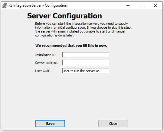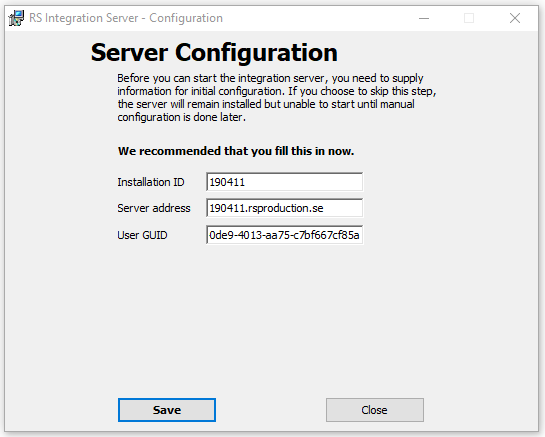 7. Now it is time to configure the integrationserver. Enter the installationnumber for the installationnumber, the adress to the server first but do not click āSaveā: