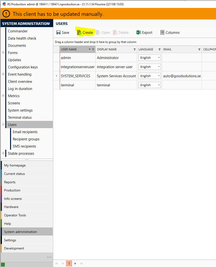 9. Now with the Office tools that was started in the beginning goto System administration/Users and create a new user called something like āIntegrationuserā. Password can be set to a random line of characters.