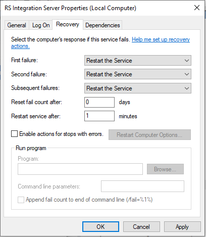 20. Go to āRecoveryā and set all three failure cases to restart the service