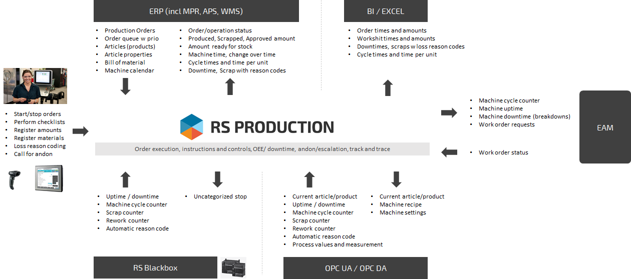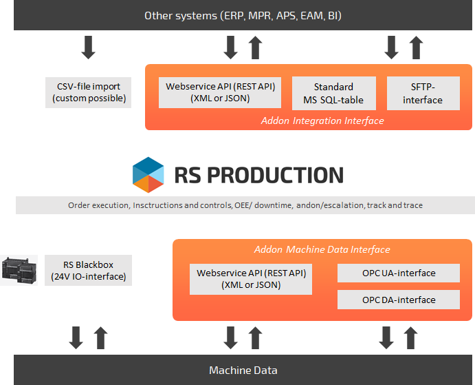RS Production have the following integration interfaces for MES. Read more details in Integration Interface and Machine Data Interface.
