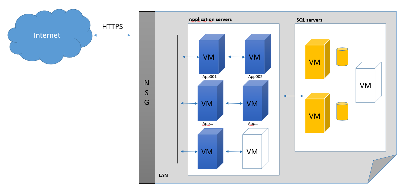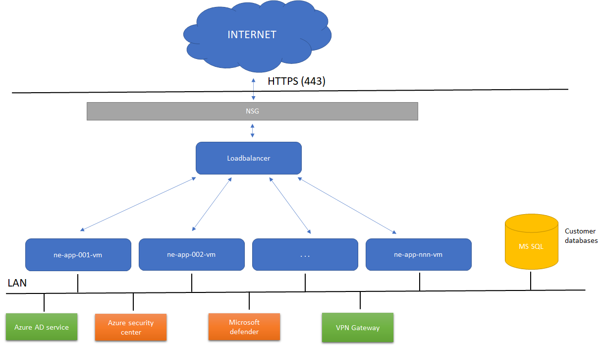 Responsibility: Host Microsoft SQL Server. Communicates with the application server over private LAN, no public ports open to the Internet, all communication between app servers and database servers on internal LAN in Azure.
