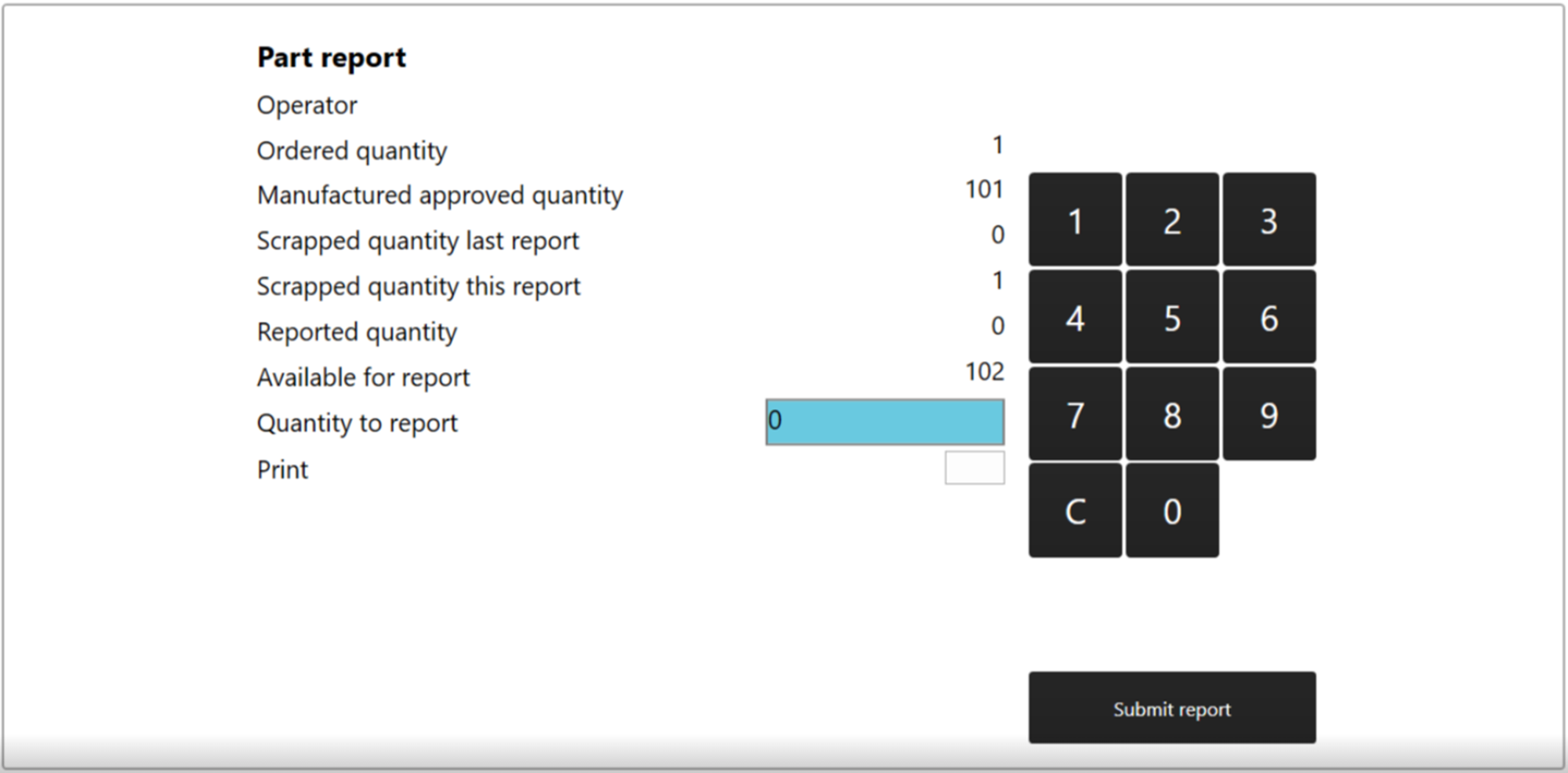 Scrapped quantity this report | This is the amount of scrap that has yet not been reported to the ERP in the previous reports on this production run. This means that this is the scrap amount that will be reported in this report. This is shown as information to the operator. |