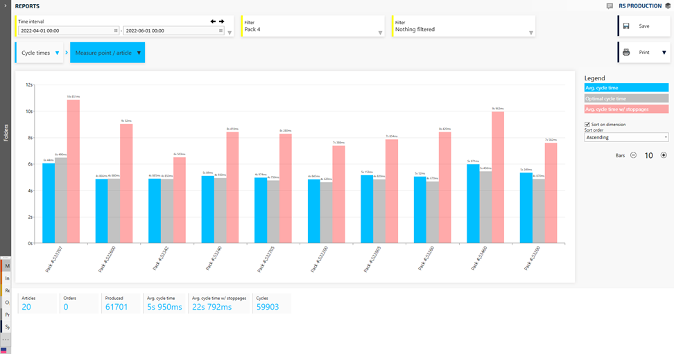 The cycle times report show you the true measured cycle times (blue bars). This is the cycle times when the measure point status is “Ok/Running”.