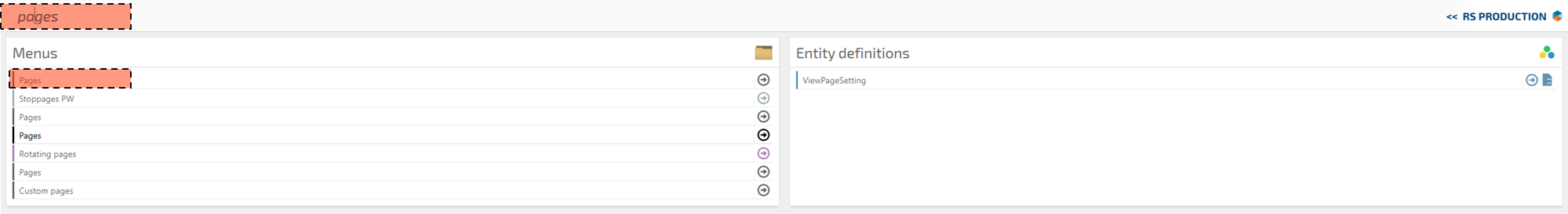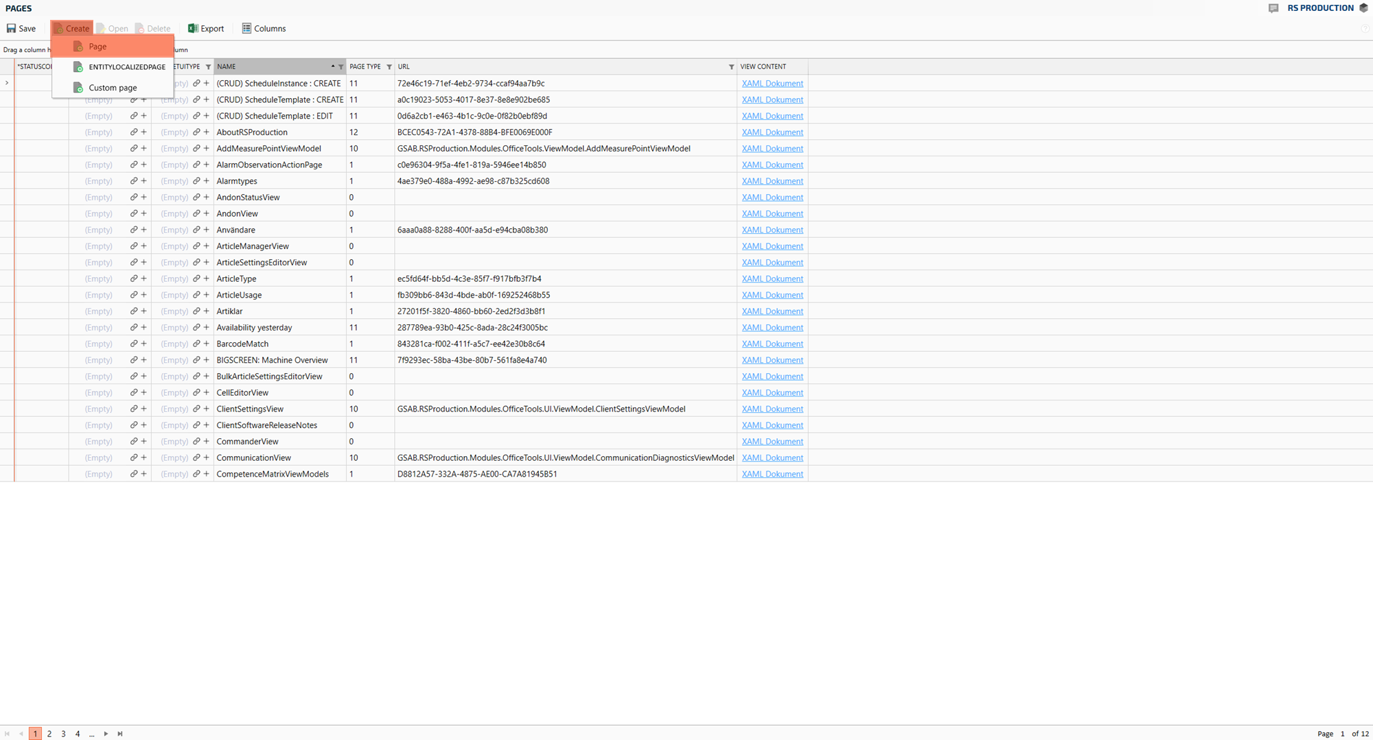 You now see complete list of all pages in your RS Production. Next thing is to create a new page for your web page. Click Create in the top menu and select Page in the drop down menu.