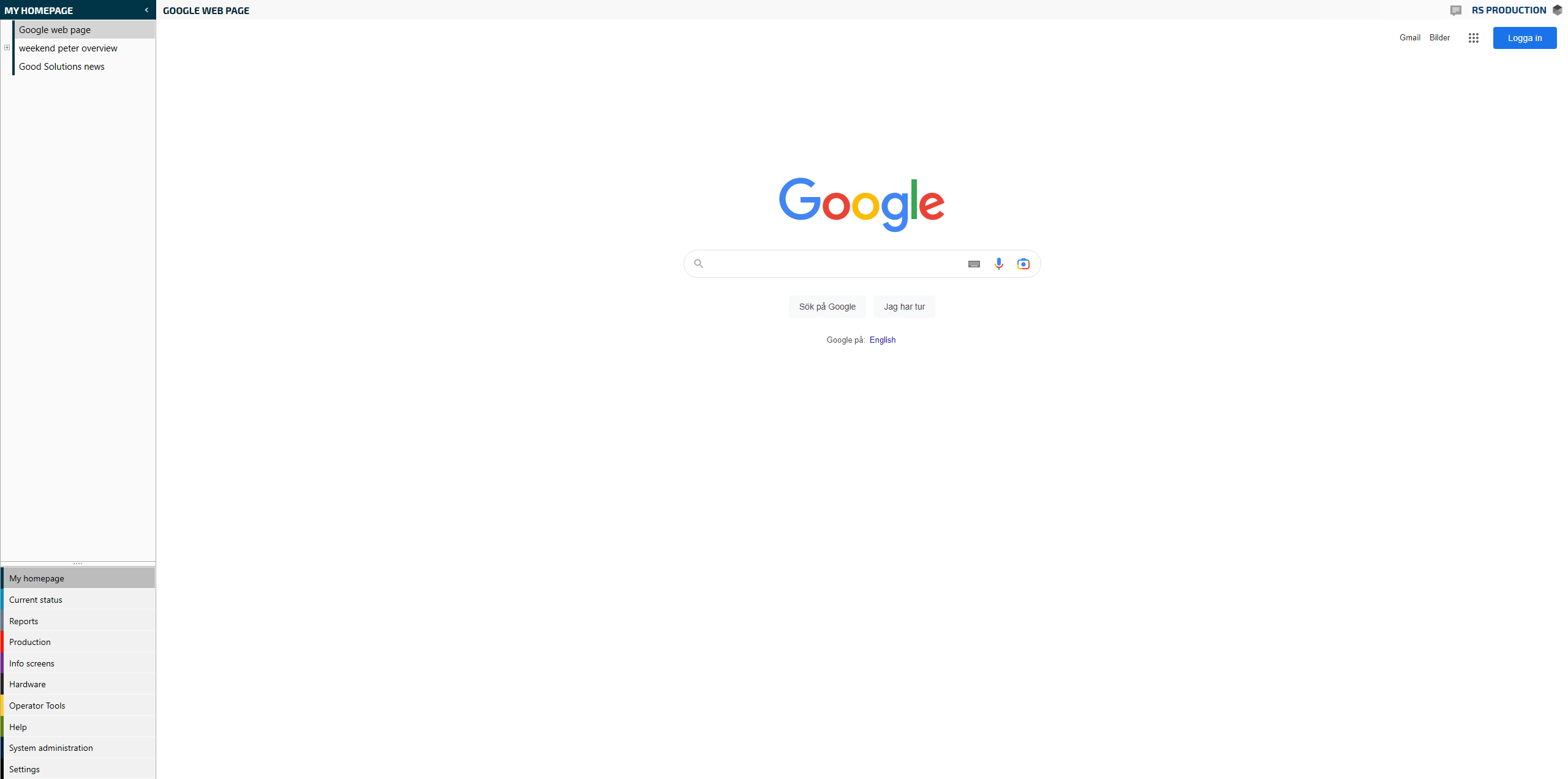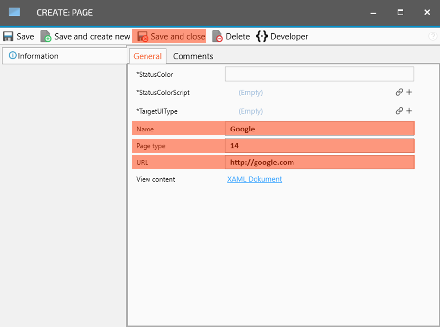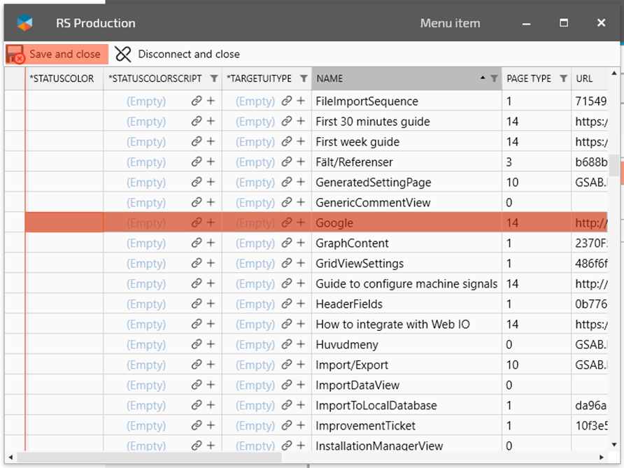 Now it is time to give some details for the web page you want to show. Name is the name of the page, not the name that will shown in the menu system in RS Production. Page type MUST be 14. URL is the adress to the webpage including the http:// - Click Save and close when ready.