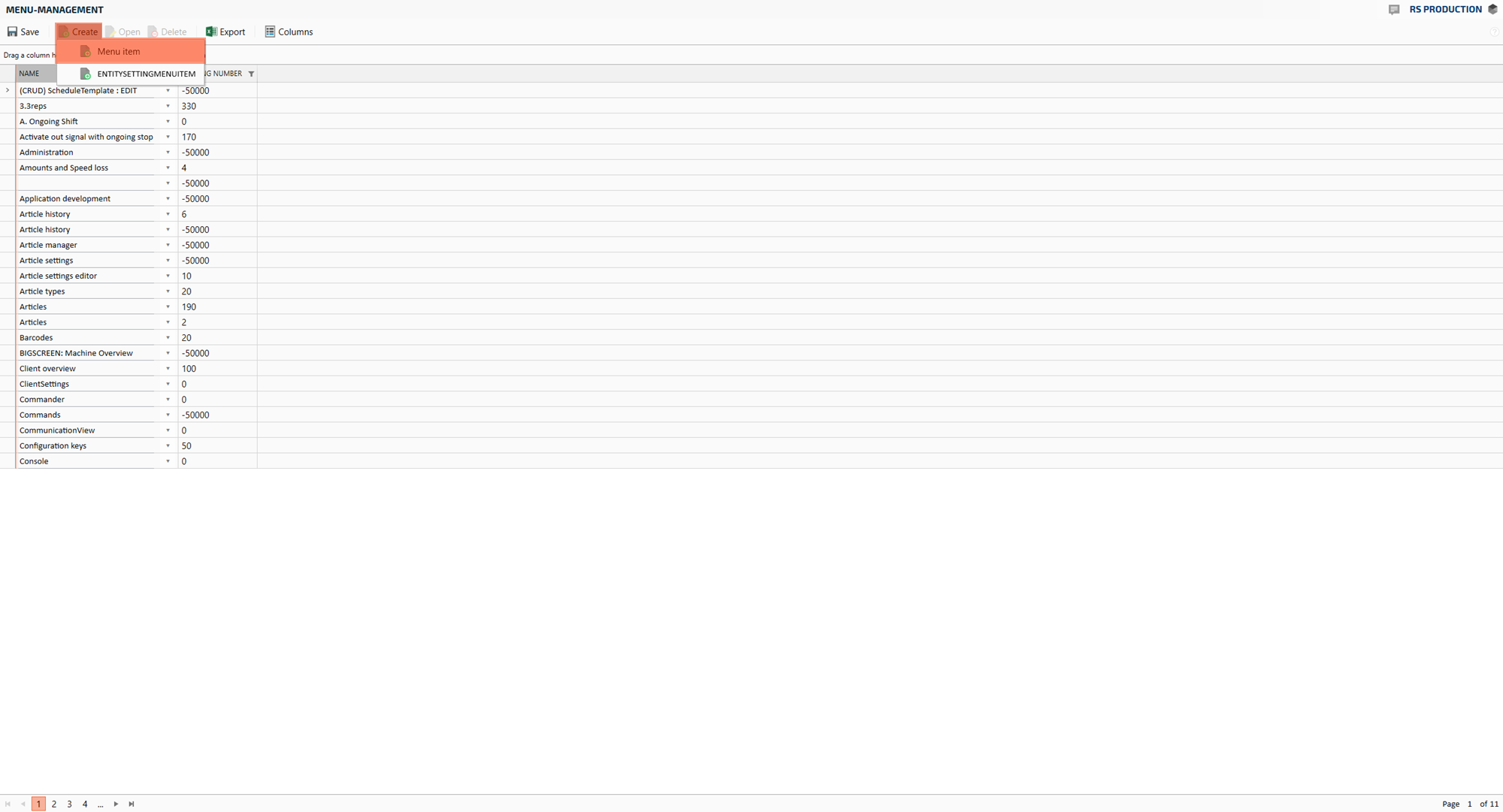 Now you see a complete list of menu items in RS Production. Next thing is to create a menu item for your new page. Click Create in the top menu, and click Menu Item in the dropdown menu.