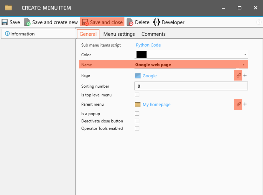 Last thing is to decide where in the menu it should be shown. You do that by selecting the Parent menu by clicking the chain symbol and select the menu item you wabt to place your new page under in the list that pops up (mark the row and click Save and close in the header menu). In this example, we place the page under the My homepage menu section.